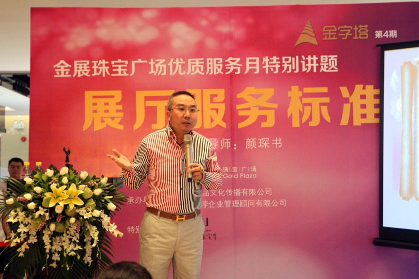 2012年9月11日下午3时整,金展珠宝广场金字塔珠宝文化课堂第四期《展厅服务标准》正式开讲。“金字塔”珠宝大课堂是金展珠宝广场在今年9月“金展珠宝时尚周”的第二场重要活动。在金展珠宝广场优质服务月期间,金展珠宝广场特别推出了以《展厅服务标准》为主题的讲座,这也是金展珠宝广场“金字塔”活动自今年开办以来的第四期。本期特别邀请了深圳意品文化传播有限公司的品牌营销顾问颜琛书导师主讲。