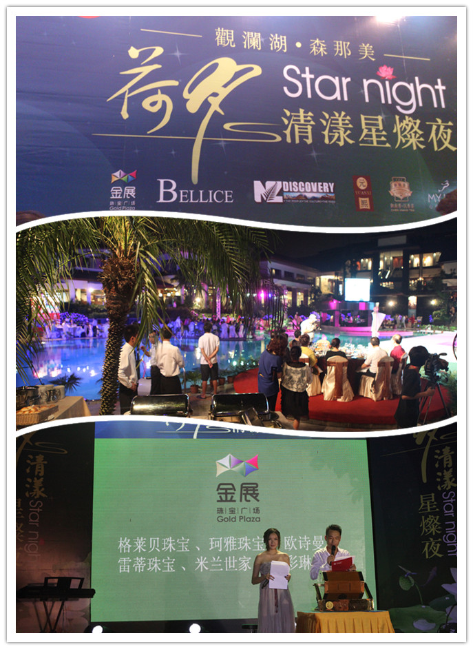 2012年7月21日晚7时,一段激昂的歌曲过后,观澜湖荷月清漾星璨夜的活动正式开始。作为本次活动的重要合办方,金展珠宝广场偕同其6家商户的珠宝品牌格莱贝珠宝、蕾蒂珠宝、米兰世家珠宝、欧诗漫珍珠、七彩琳翡翠、珂雅翡翠一同受邀参加此次盛大晚宴。