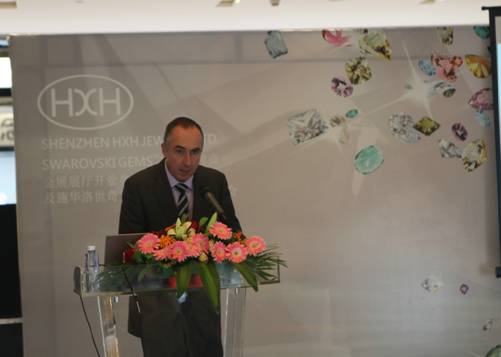 为营销SWAROVSKI GEMS品牌,拓展天然宝石部门业务,SWAROVSKI GEMS(施华洛世奇宝石)携手HXH(华星行--施华洛世奇宝石南中国区唯一官方授权代理商)与Gold Plaza(金展珠宝广场)选址深圳水贝珠宝园金展中心,作为SWAROVSKI GEMS华南中国区官方代理唯一的一家天然宝石展厅。华星行于此隆重邀请SWAROVSKI GEMS大中华区总裁Jean-Michel ROUX先生及其团队,同时盛意邀请钻之韵总经理耿典贵先生及其金展团队参加本次开业典礼。