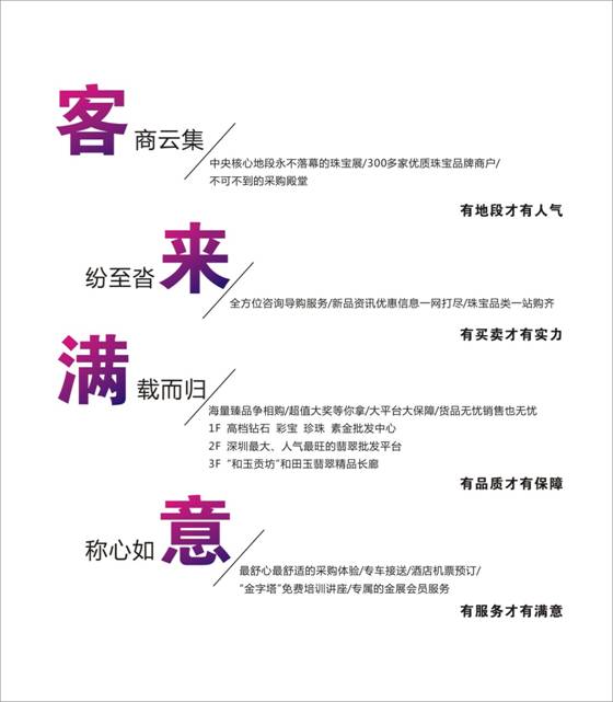 金展珠宝团购节主打服务牌,强调对采购商和商户的双重服务。与一般团购活动打出的“低价”噱头不同,金展珠宝广场此次针对夏季采购旺季推出的“金展珠宝团购节”活动,提供给采购商的是便利的服务和最真实的商户新品、优惠信息。